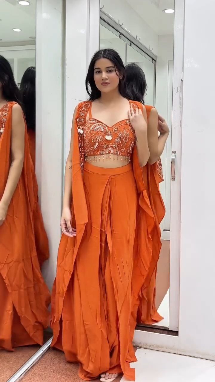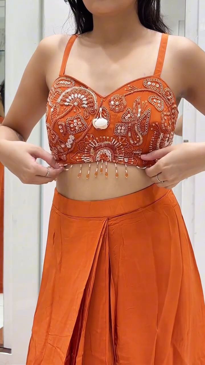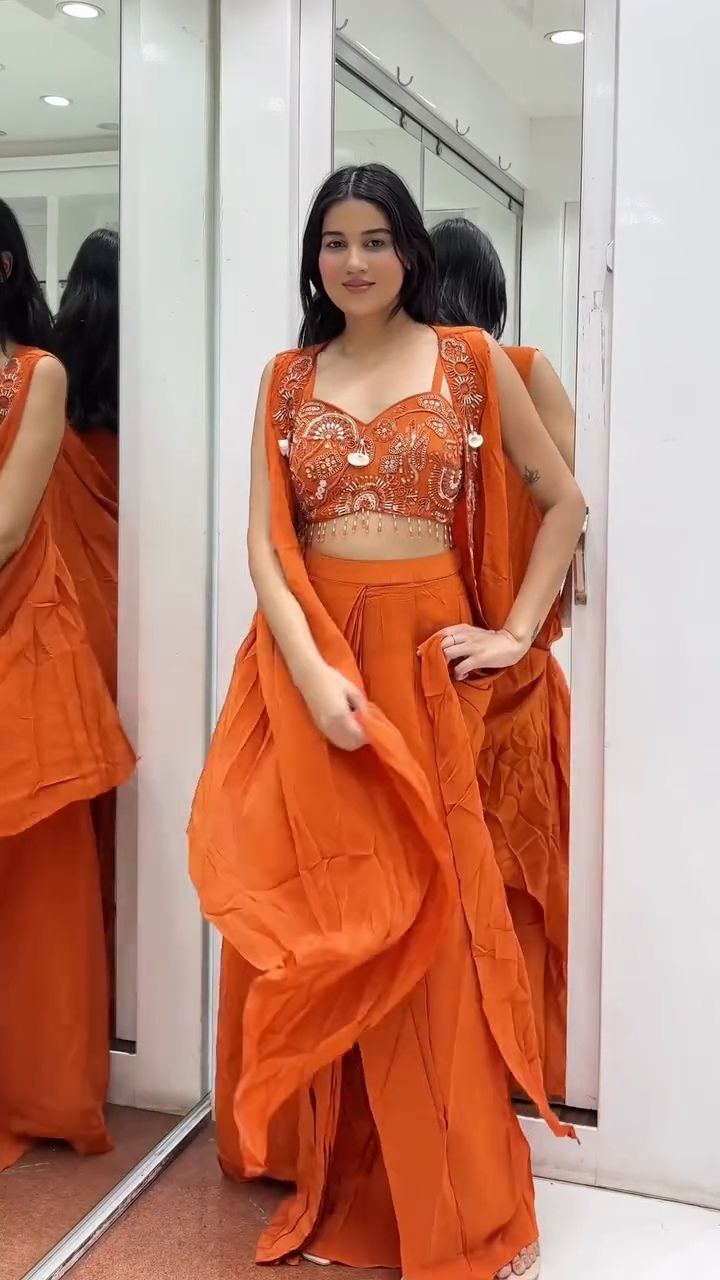 Turn heads in this Burnt Orange Embroidered Crop Top with Draped Palazzo Set, designed to blend comfort with festive elegance. The intricately embroidered crop top features mirror work and delicate thread detailing, accentuated with playful shell tassels. The draped palazzo adds fluidity and movement, offering a modern twist to traditional wear.