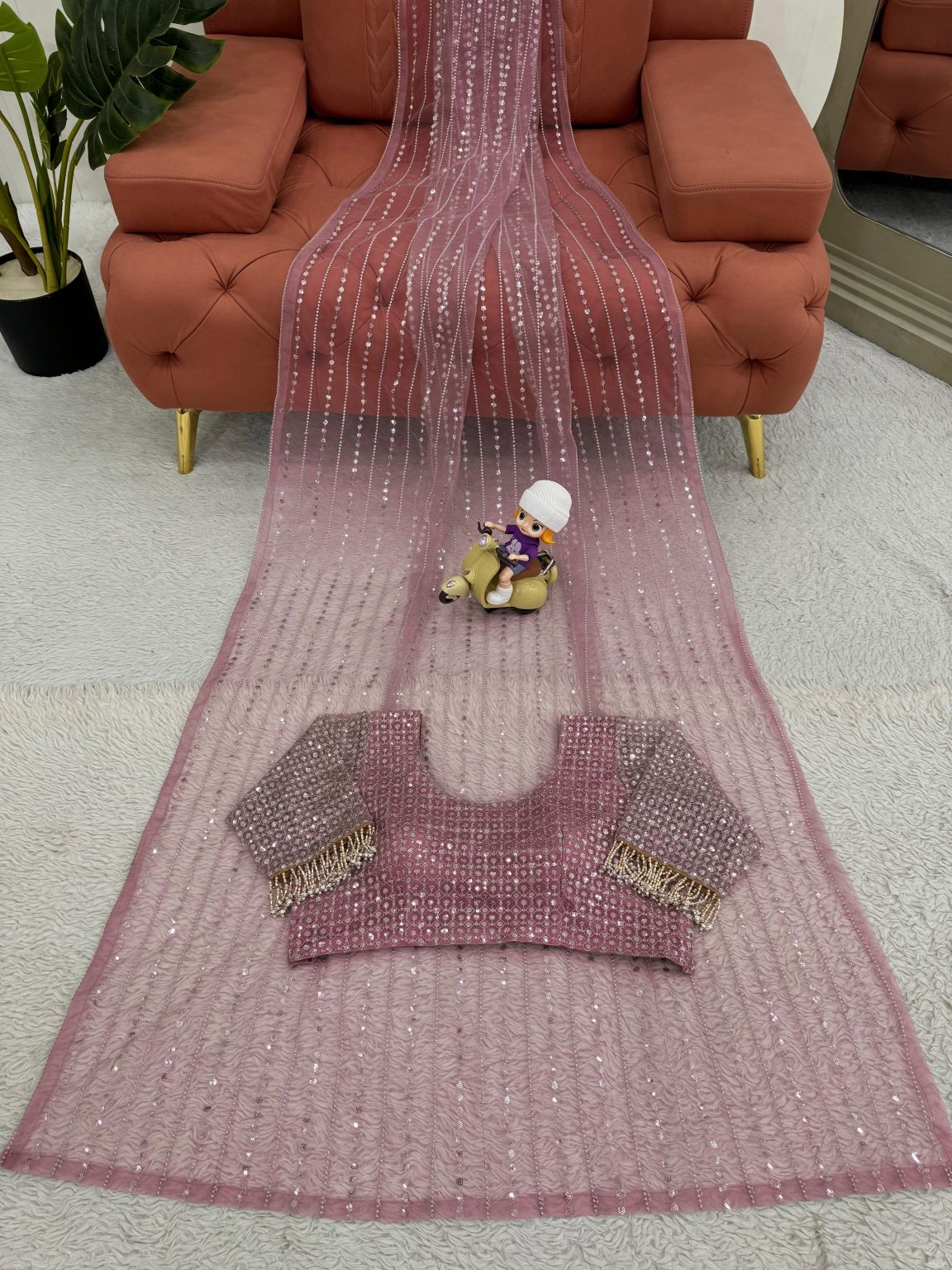 Turn heads at every occasion with this Sparkling Mauve Designer Saree, a perfect blend of elegance and glamour. Crafted from lightweight georgette, it drapes beautifully and adds a subtle shimmer with every move. The all-over sequin detailing enhances its rich, festive appeal, while the matching blouse piece completes the statement look.