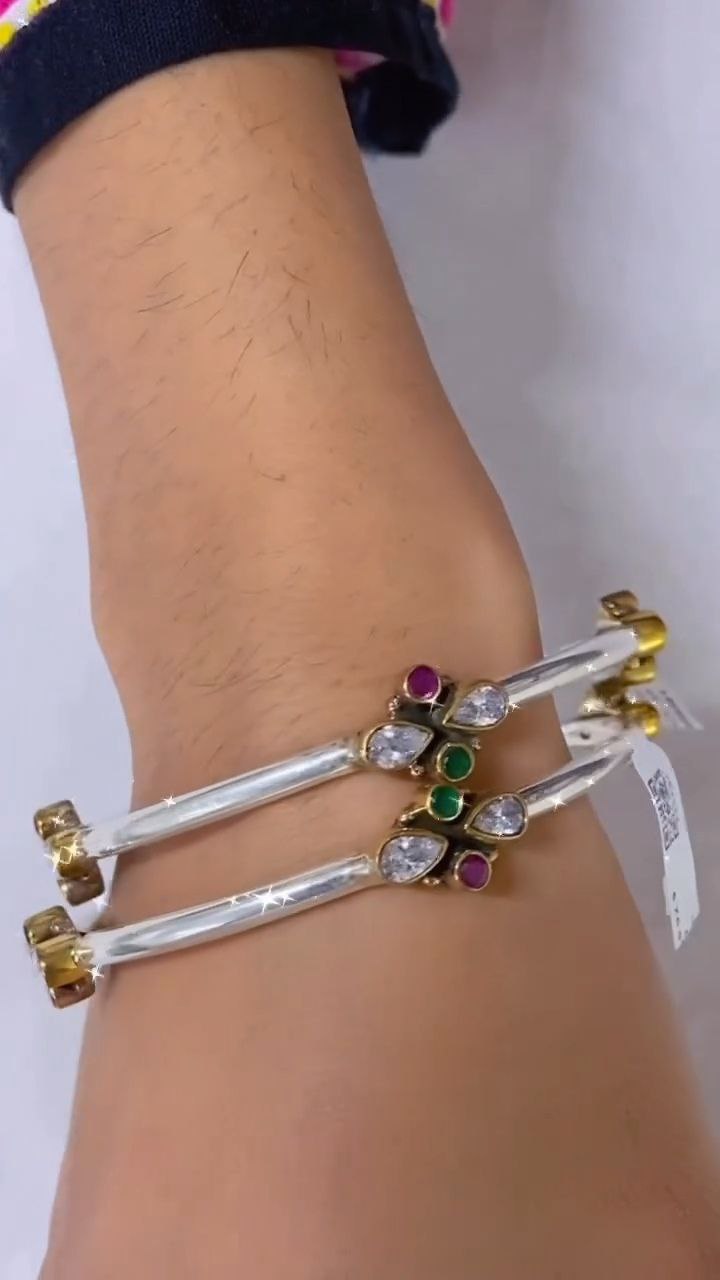 An elegant dual-tone open cuff bracelet featuring clear crystal stones accented with green and ruby-toned details, designed with a sleek silver finish and gold-toned stone settings for a refined traditional-meets-modern look.