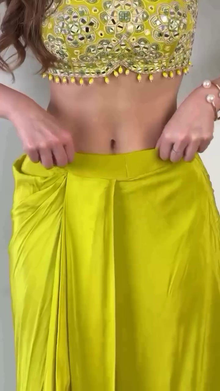 Lime yellow embroidered palazzo has elasticated waistband with button closure