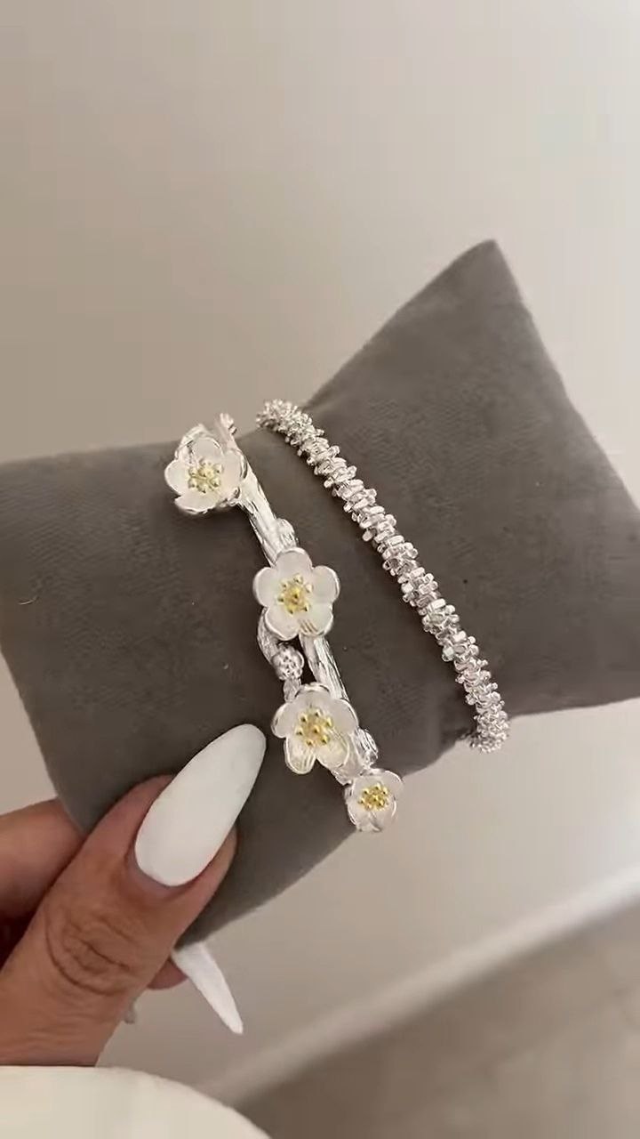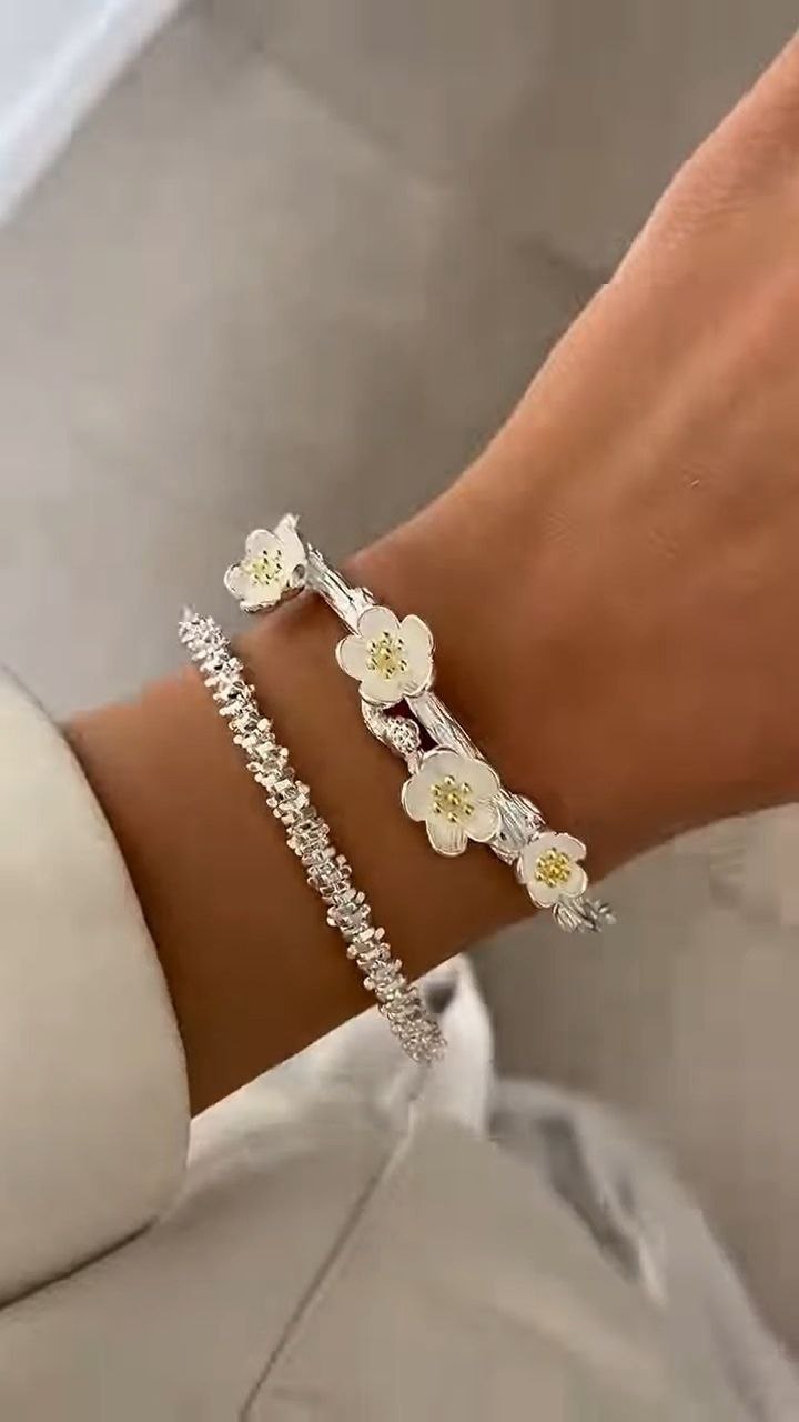 This graceful open cuff bracelet is designed with a blend of floral artistry and subtle sparkle. One side features finely sculpted flower motifs with soft golden centers, while the other is adorned with a row of shimmering crystals that enhance its refined appeal. Crafted in a polished silver-tone finish, the bracelet offers an adjustable, comfortable fit and a lightweight feel. Perfect for special occasions or elegant everyday wear, this piece adds a touch of feminine charm and sophistication to any jewelry collection.