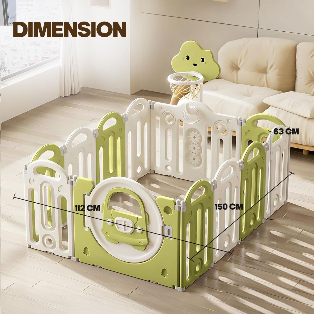 A spacious, modular baby playpen featuring secure locking panels, an easy-access safety gate, and child-friendly activity elements for safe indoor play.