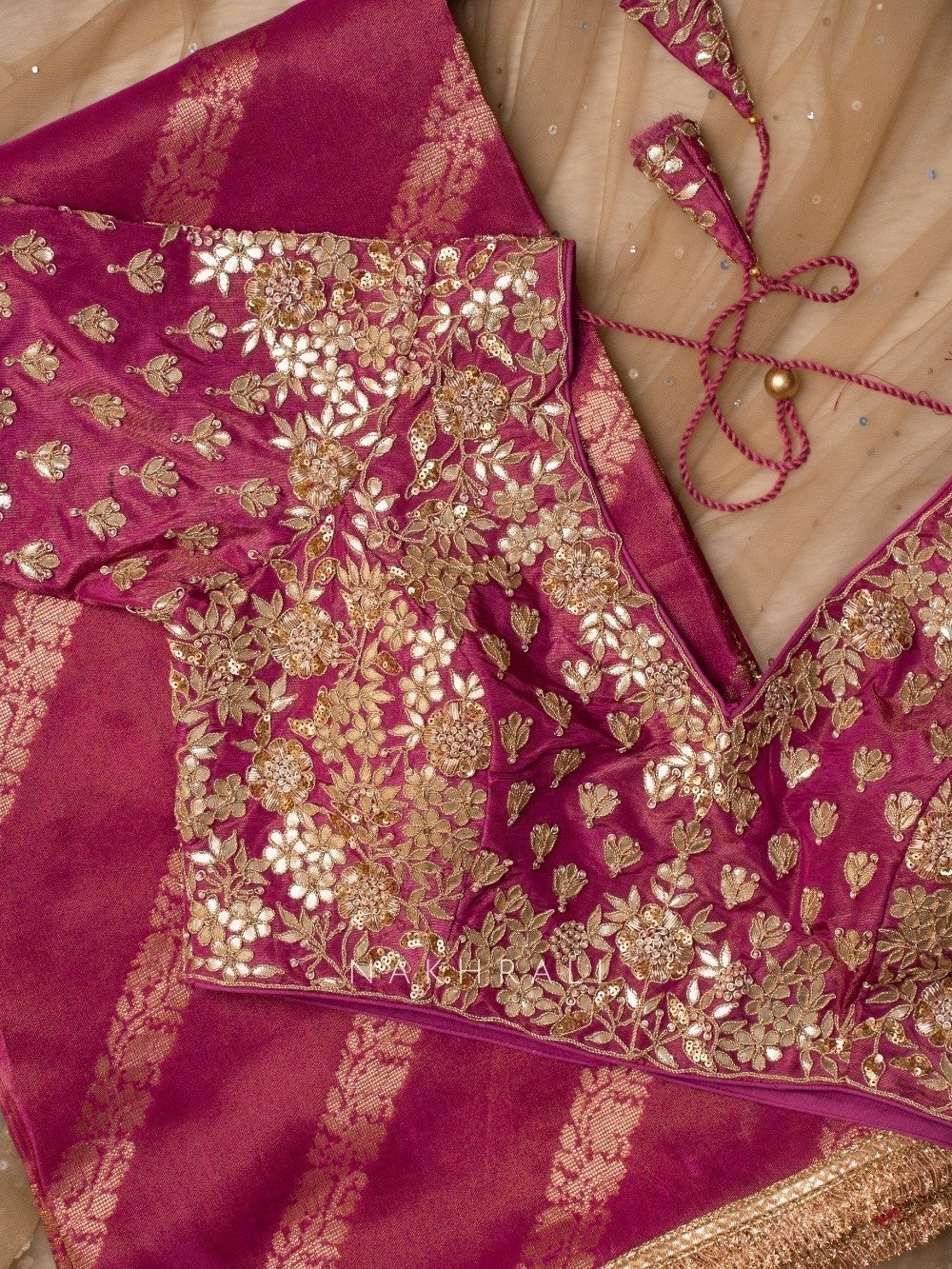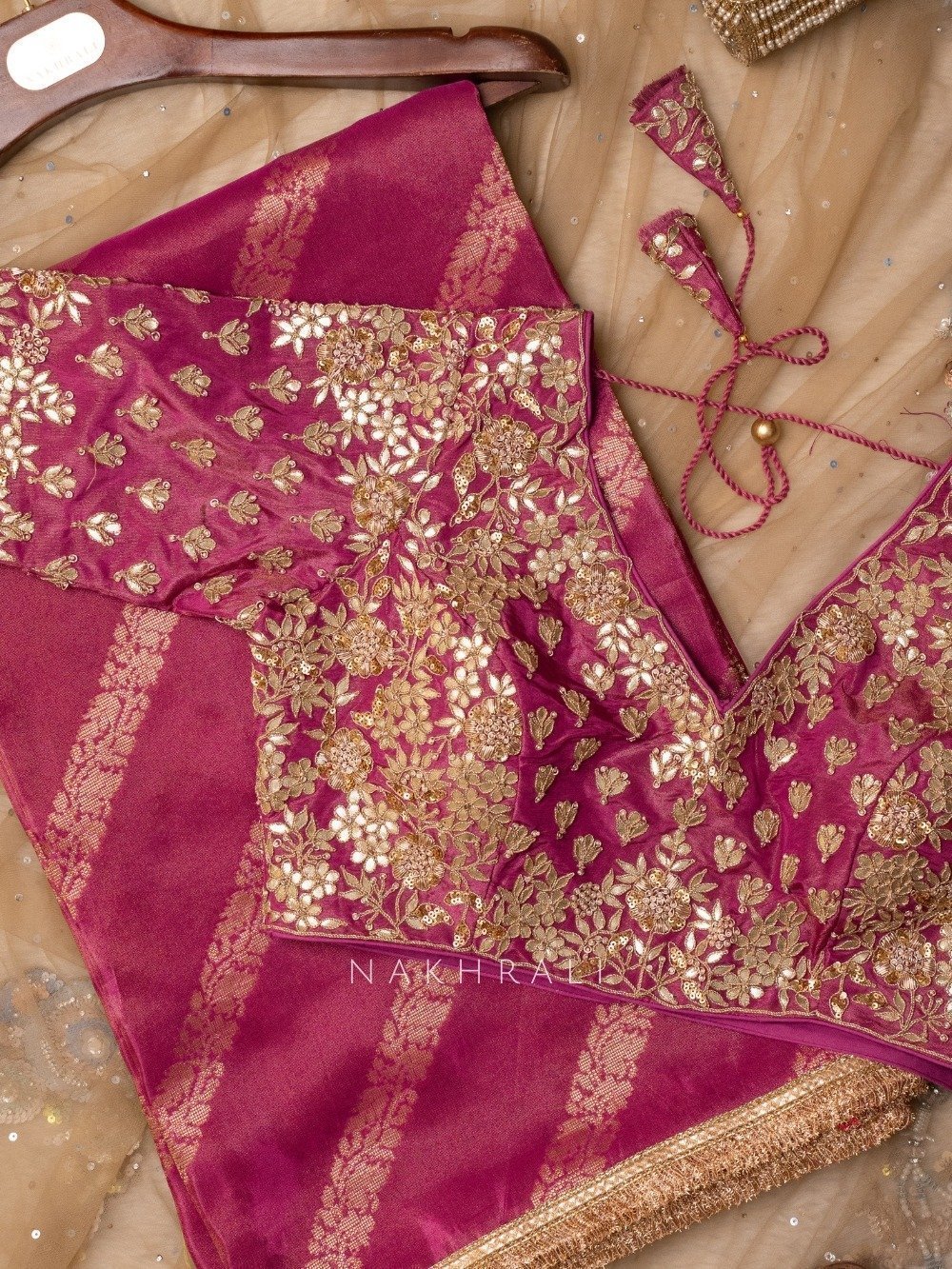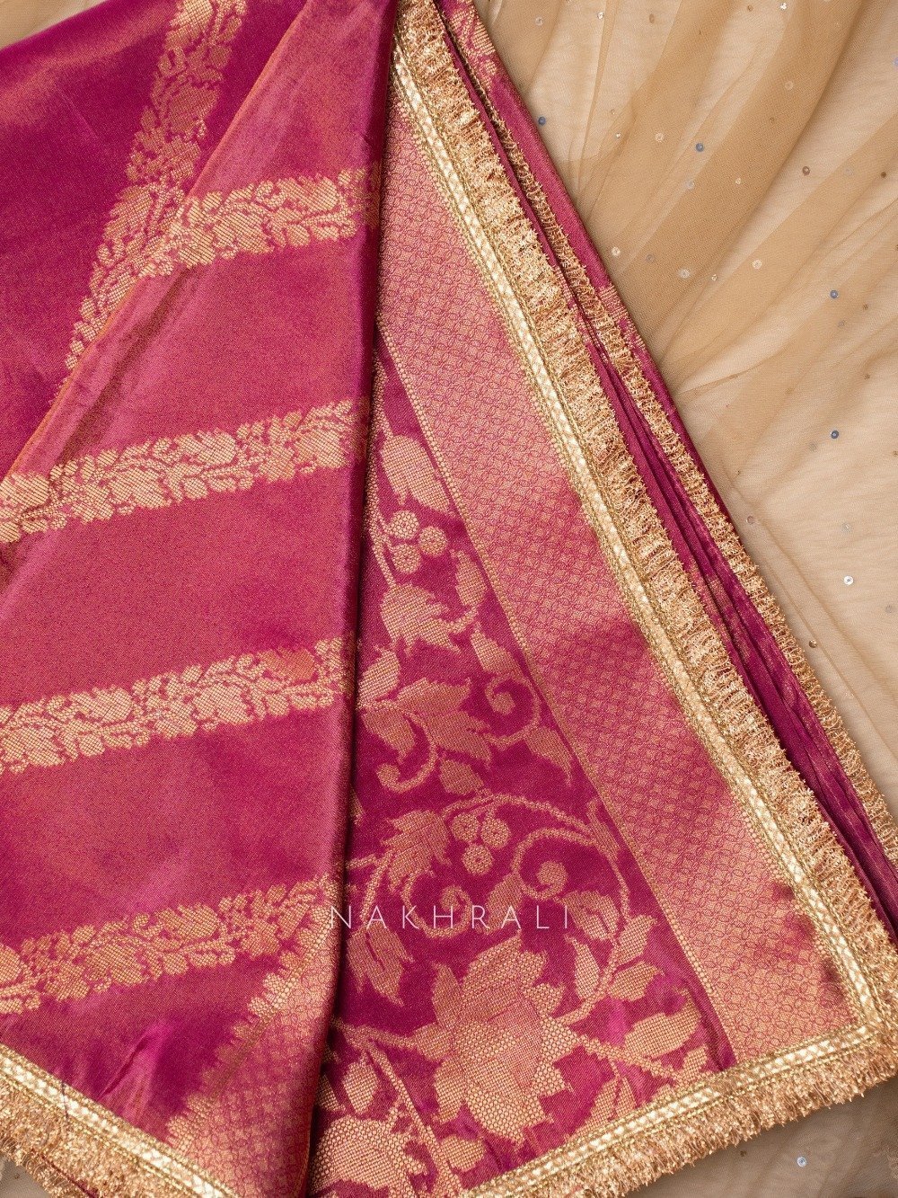 Vintage Soft Lichi Saree with beautiful Digital Print and a rich border. Includes an unstitched Soft blouse with an exclusive jacquard border. Set contains a 5.50m saree and a 0.80m blouse piece. Dry clean only. Minor color variations possible.