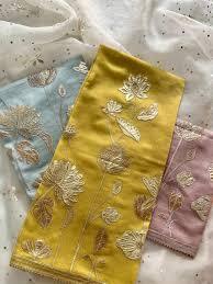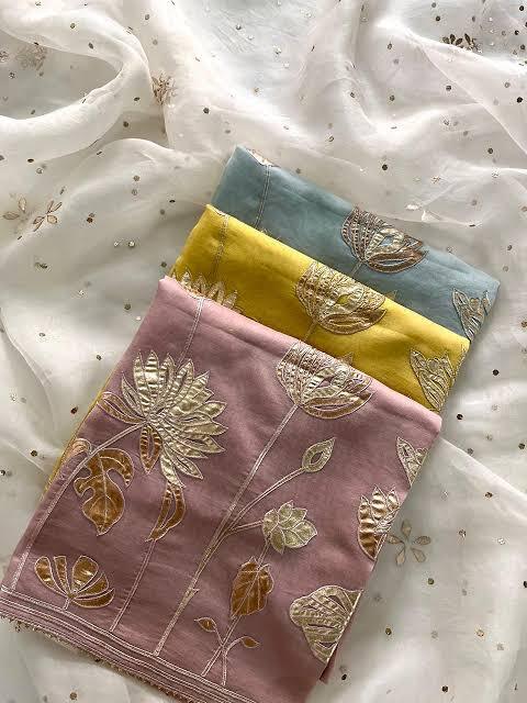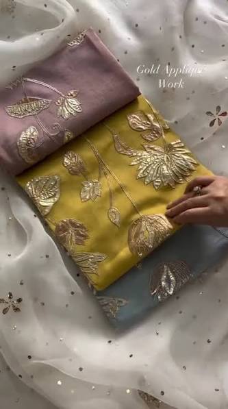 The dupatta is crafted from a premium, lightweight, and sheer fabric that drapes beautifully, creating a soft and flowing silhouette. The transparency of the material ensures that the intricate work remains the focal point while still allowing the base outfit to shine through. The main attraction is the bold and beautiful appliqué work, featuring large, stylized floral motifs. These motifs are expertly crafted from a shimmering gold fabric, which is meticulously stitched onto the base material. The leaves and petals are done in a mix of solid and textured gold, creating a rich, multi-dimensional effect that catches the light from every angle. The use of gold thread in the appliqué not only outlines the shapes but also adds fine detailing, giving the flowers a lifelike quality. This meticulous attention to detail is what sets this piece apart and makes it truly special.