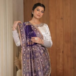 Turn heads with this stunning one-shoulder satin co-ord set in a rich purple hue. Adorned with delicate vertical sequin embroidery, this outfit is perfect for modern festive vibes. The flowy palazzo pants offer elegance with comfort, while the asymmetrical neckline brings a stylish twist.