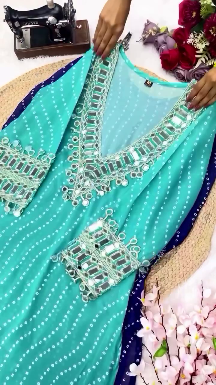 Mirror Work Georgette Anarkali Kurta Set with Bandhej Print