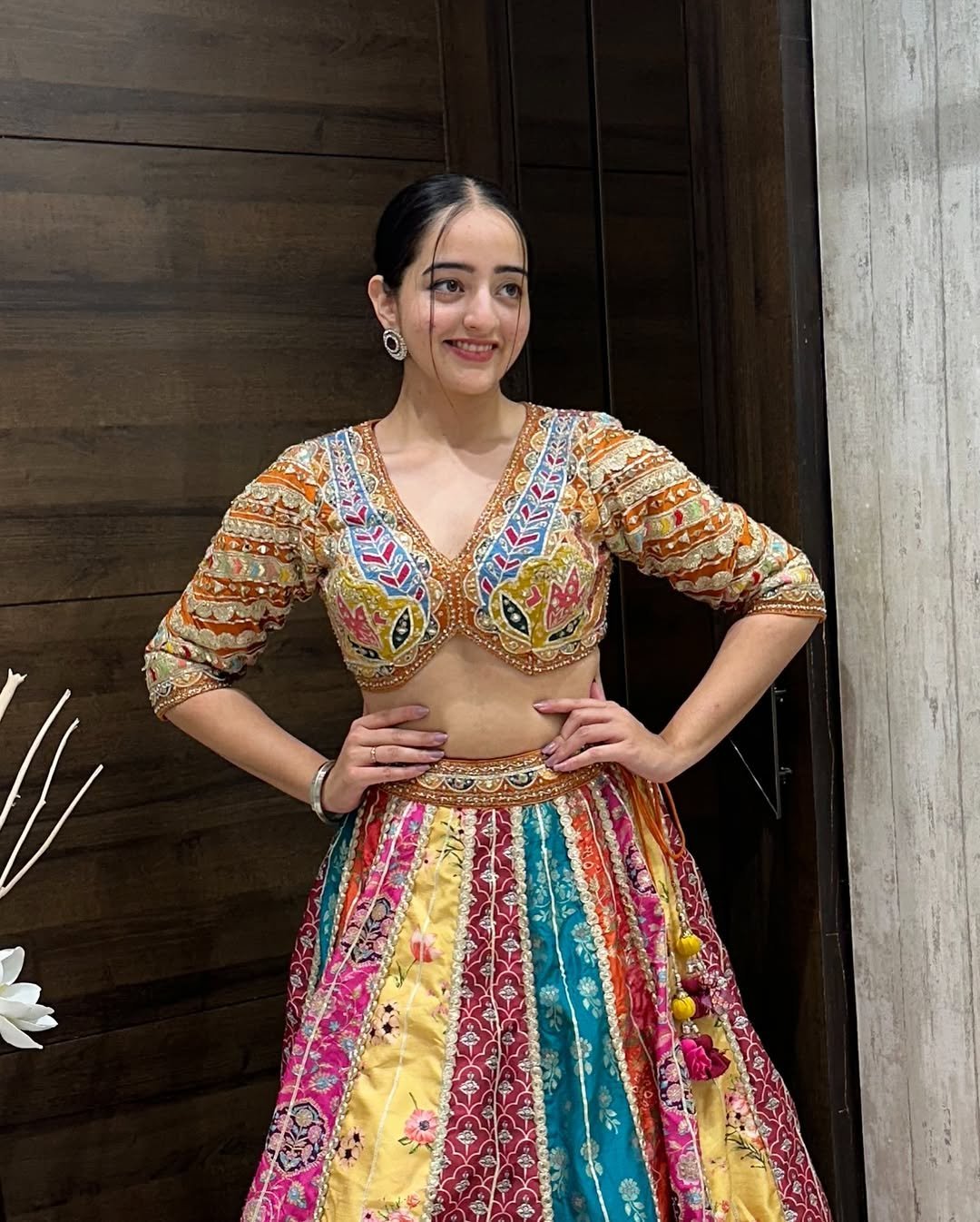 Celebrate culture with color in this vibrant multicolor lehenga choli set that’s made to stand out. The blouse features detailed multicolor mirror and thread embroidery with a sweetheart neckline and elbow-length sleeves. The lehenga is a riot of bright hues crafted in multiple silk panels with heavy gota and thread border. Paired with an orange net dupatta adorned with mirror work and lace border, this set is a perfect blend of traditional craft and youthful flair—ideal for Navratri, Garba, or Haldi ceremonies.