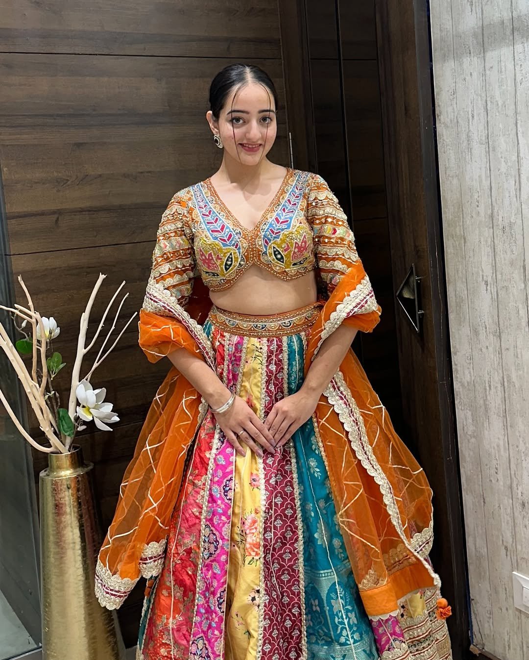 Multicolor Panelled Lehenga Choli with Heavy Embroidery & Orange Dupatta