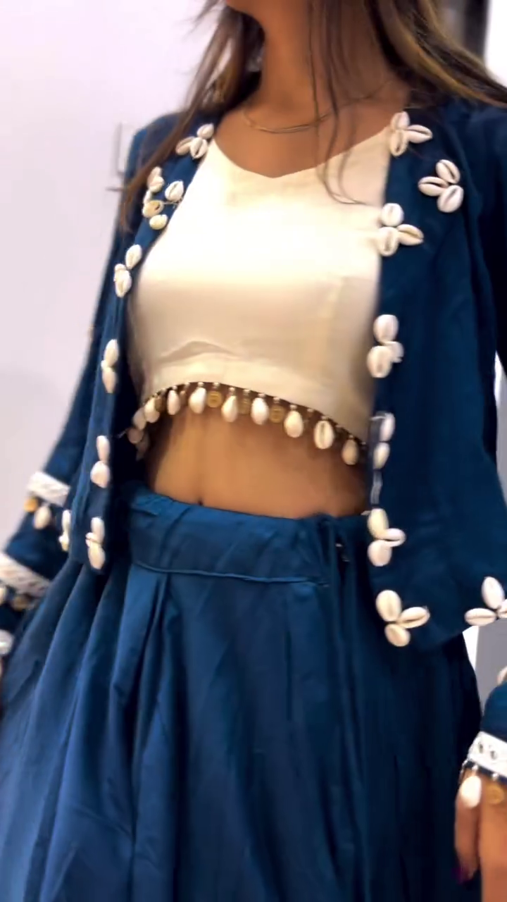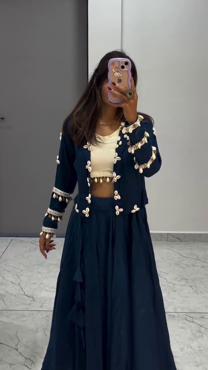 Navy Blue Shell Work Jacket Lehenga Set with Crop Top
