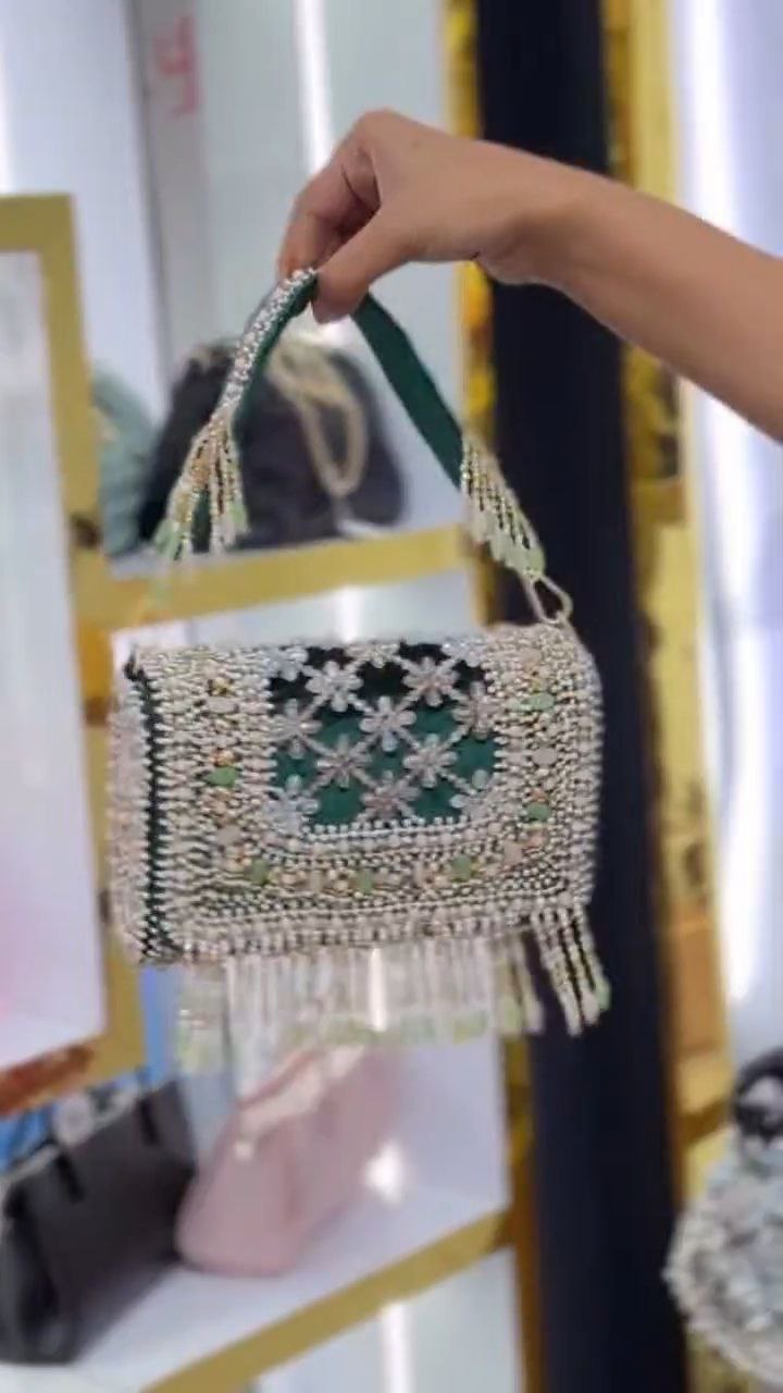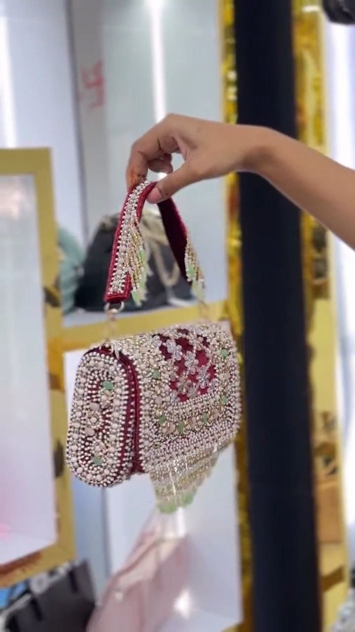 This maroon pearl-embellished potli handbag is a statement accessory crafted for traditional and celebratory occasions. The structured design is richly decorated with intricate pearl work, stone accents, and delicate floral patterns, creating a regal and handcrafted appeal. The handle features elegant tassel embellishments that add movement and charm, while the base is finished with fine hanging beads for a graceful silhouette. Ideal for weddings, festive events, and ethnic celebrations, this handbag combines traditional craftsmanship with contemporary elegance, making it a perfect companion for carrying essentials in style.