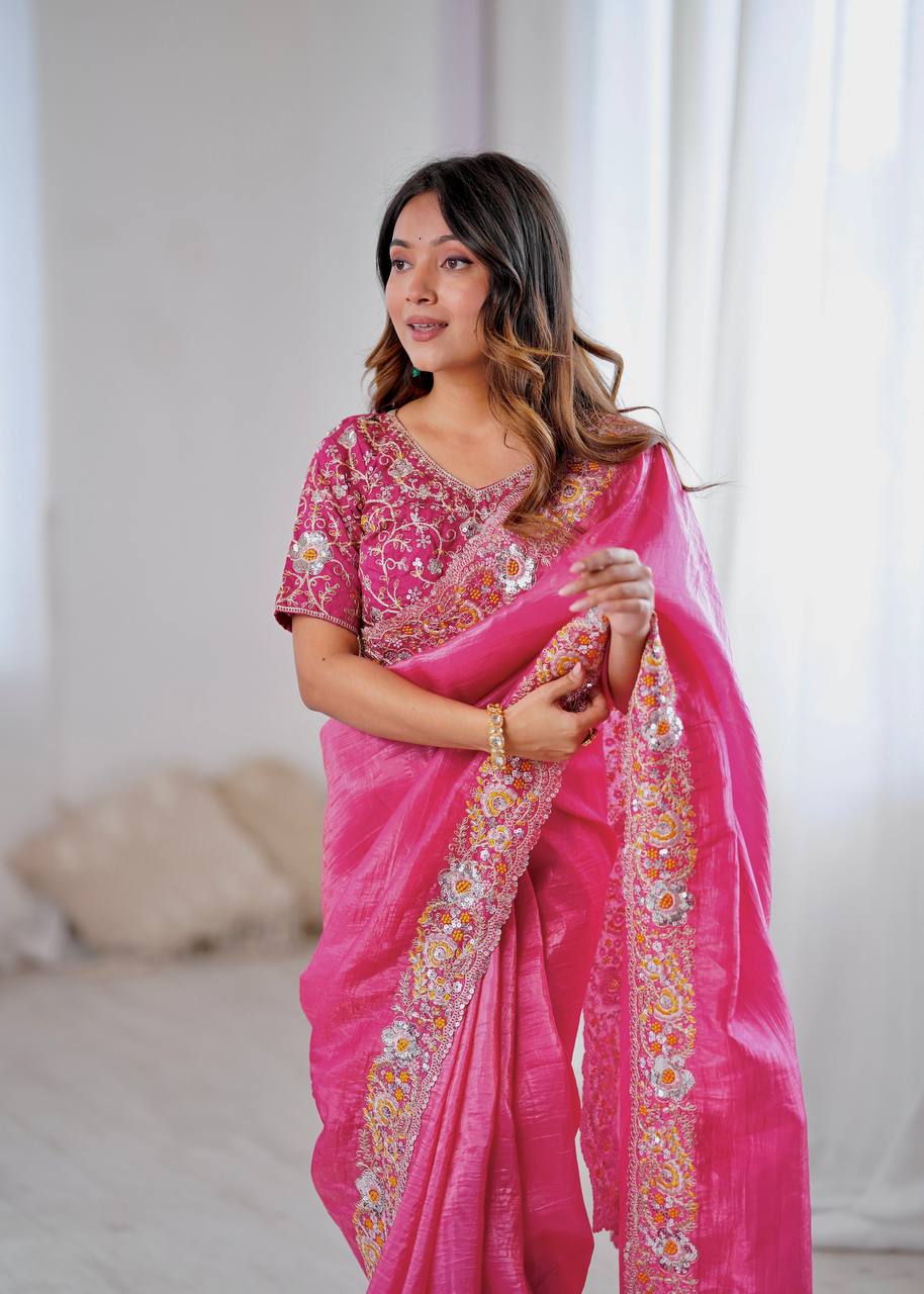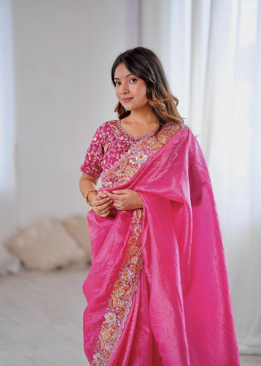 🥻 Sari Fabric: Premium Gold Crush With Heavy Embroidery Threads 🧵 Codding & Sequins Work